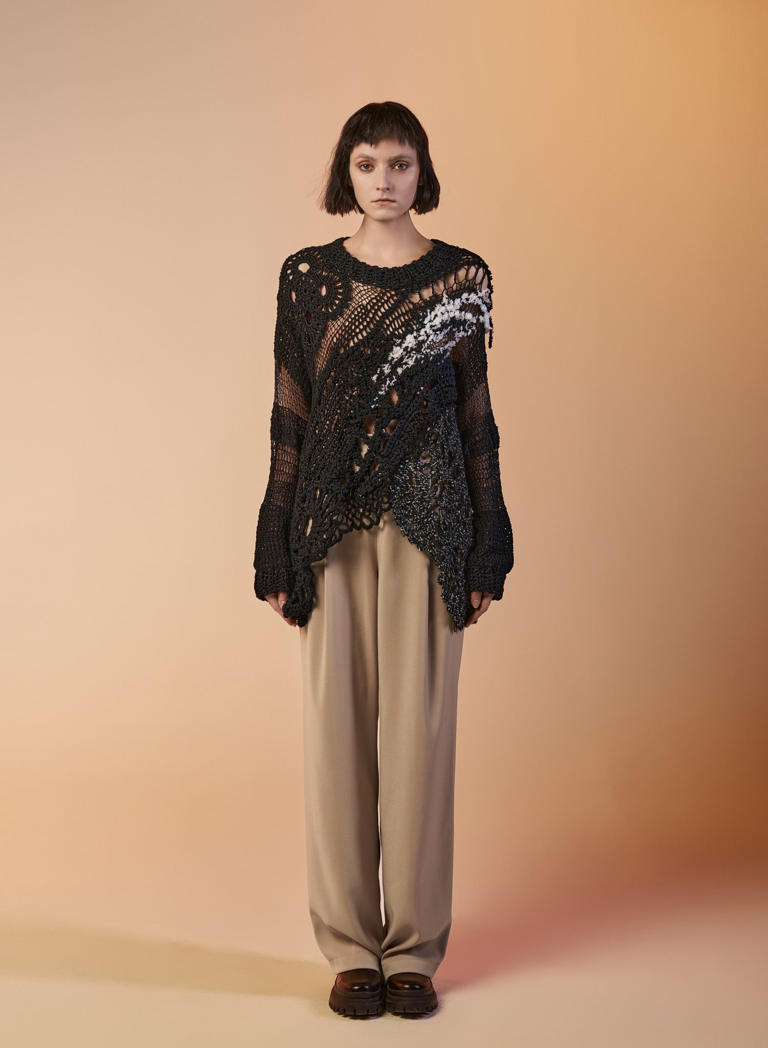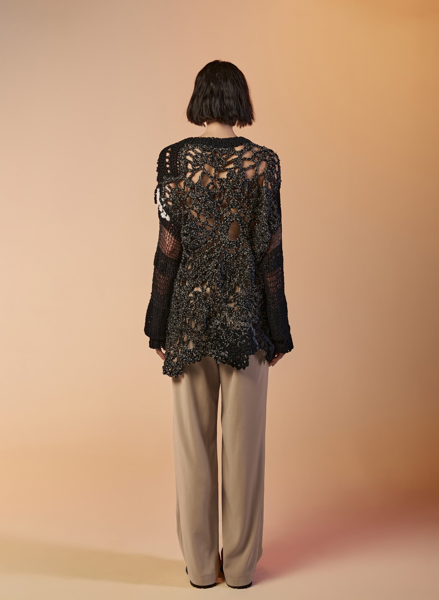 This unique handmade crochet sweater features intricate patterns and a textured design that stands out. This sweater is entirely hand-crocheted, and made from soft, high-quality yarn, providing warmth and comfort.
